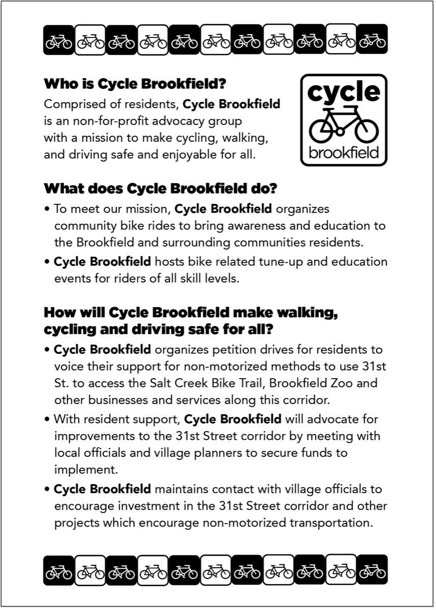 Cycle Brookfield is currently working with the village to get the Village to provide matching grant funding for a study to allow a cycling and walking path along 31st street between Prairie Avenue and First Avenue.Trail Extension Issue